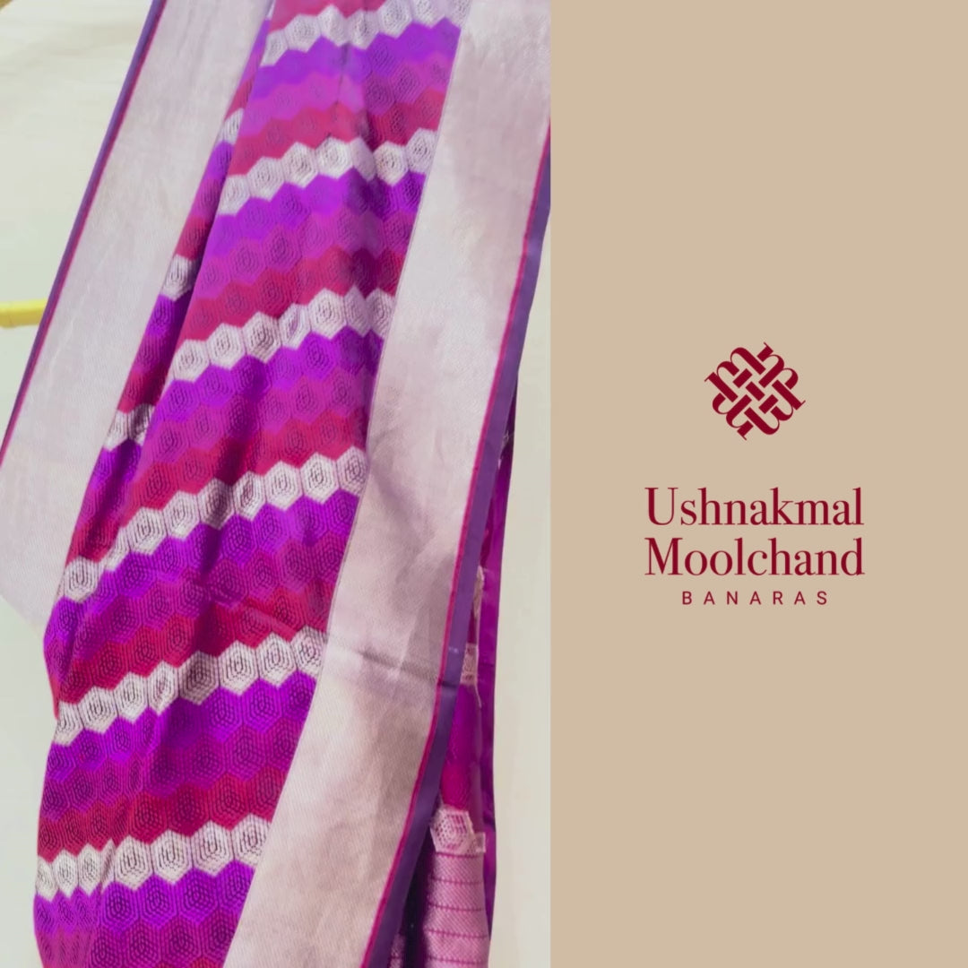 Design: Introducing the Handloom Katan Silk Henna Saree, a vibrant celebration of colour, craft, and heritage. This exquisite drape features a stunning aadha rangkat pattern, where shades of purple, pink, red, and silver flow in rhythmic stripes, creating a contemporary yet deeply traditional visual. Each segment is woven separately in the katraua technique, giving the saree its beautifully defined texture and unmatched richness.