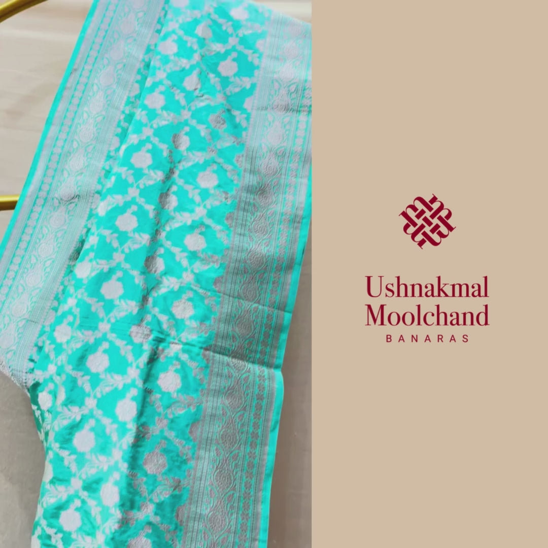 Speciality: Woven using the heritage Katraua jaal technique, this saree is a celebration of Banaras’ handloom artistry. The continuous jaal requires exceptional precision and craftsmanship, making each piece a labour of love. Lightweight, lustrous, and heirloom-worthy—the aqua Noor is designed for women who appreciate tradition wrapped in freshness.