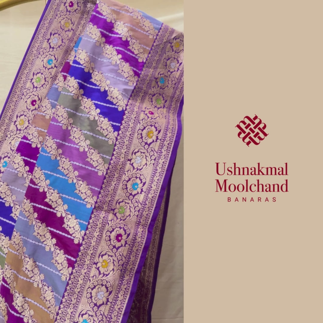 This saree stands apart for its Kadhwa Rangkat weaving on pure Katan silk, a labour-intensive technique that results in sharper motifs, a neat reverse, and long-lasting quality. The seamless interplay of colours with precise handwoven detailing makes the Reem Saree a timeless heirloom piece, rooted in Banaras’ weaving legacy.