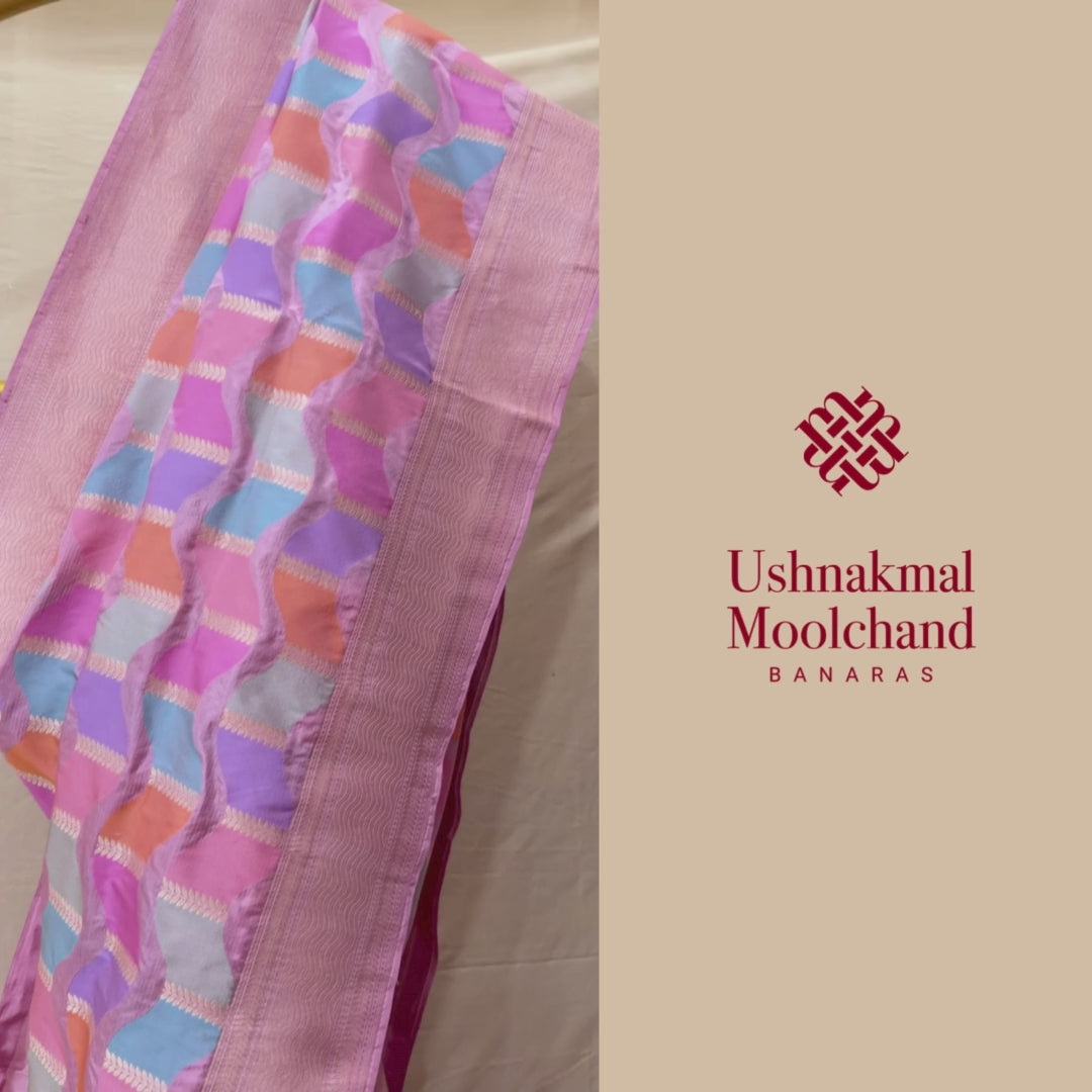 The Katan Silk Handloom Vara Rangkat Saree is a soft yet striking expression of colour-play, woven meticulously on pure Katan silk using the traditional Rangkat technique. As reflected in the image, the saree features a harmonious grid of pastel hues, gentle pinks, lavenders, peaches, and powder blues; each shade seamlessly transitioning into the next.