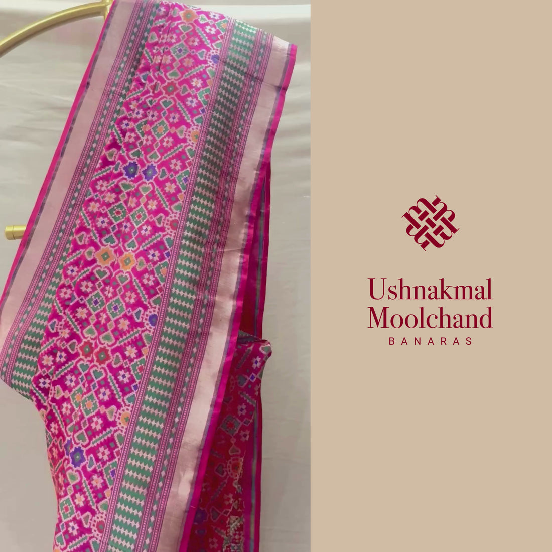 Design: A modern take on the traditional Ghatchola, this saree features an exquisite all-over grid pattern, where each box blooms with vibrant motifs. Adding a playful charm to the design are delicate heart-shaped patterns, woven intricately into the ghatchola jaal. The radiant rani base is enlivened with a spectrum of festive colors; green, yellow, purple, red, orange with zari threads adding a luminous sparkle throughout. A unique geometric border frames the saree, enhancing its bold and contemporary appeal while staying rooted in heritage.