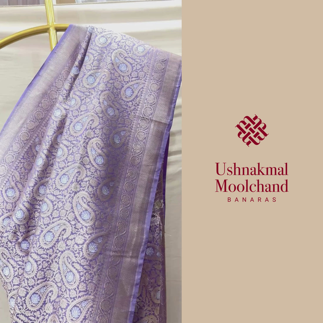 Color: Pastel Lavender with zari paisley butis across the body Fabric: Pure Katan Silk Weave/Technique: Kadhwa Weave – Brocade Banarasi Handloom Design: The Brocade Banarasi saree is woven with the timeless Kadhwa technique, wh...