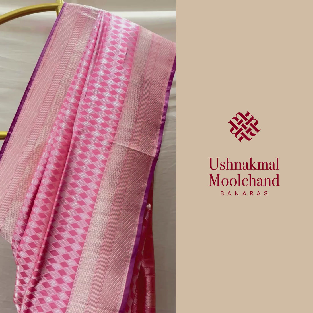 Color: Soft Peach with a rich Zari Geometrical Jaal Fabric: Pure Katan Silk Weave/Technique: Kadhwa Weave Design: The Zari Vasket is one of Banaras’ most prized weaves, crafted using the intricate Kadhwa technique, where each m...