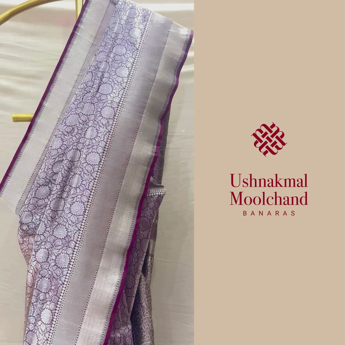 Color: Deep Jamuni with rich Zari detailing Fabric: Pure Katan Silk Weave/Technique: Kadhwa Weave Design: The Zari Vasket is among the most intricate Banarasi weaves, brought to life through the painstaking Kadhwa technique, wh...