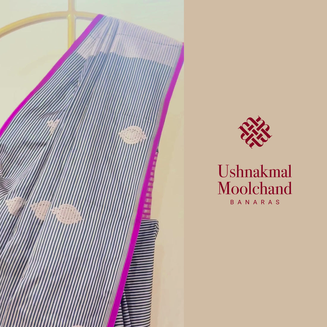 Color: Black & White Stripes with Fuscia Pink Kanni and Zari Motifs Fabric: Pure Katan Silk (finest quality silk) Weave/Technique: Handwoven Kadhwa Weaving Design: Stripe Kadhwa Saree – A striking balance of traditi...