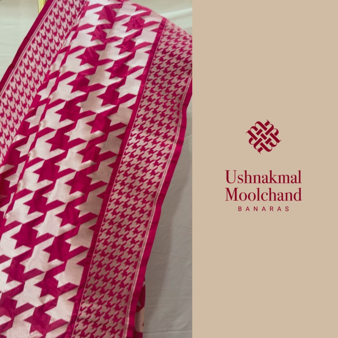 Colour: Red Fabric: Pure Katan Silk Weave/Technique: Handloom Katraua Weave Design Motif: Houndstooth The Katan Silk Handloom Houndstooth Saree is a rare confluence of timeless Banarasi craftsmanship and modern design language....