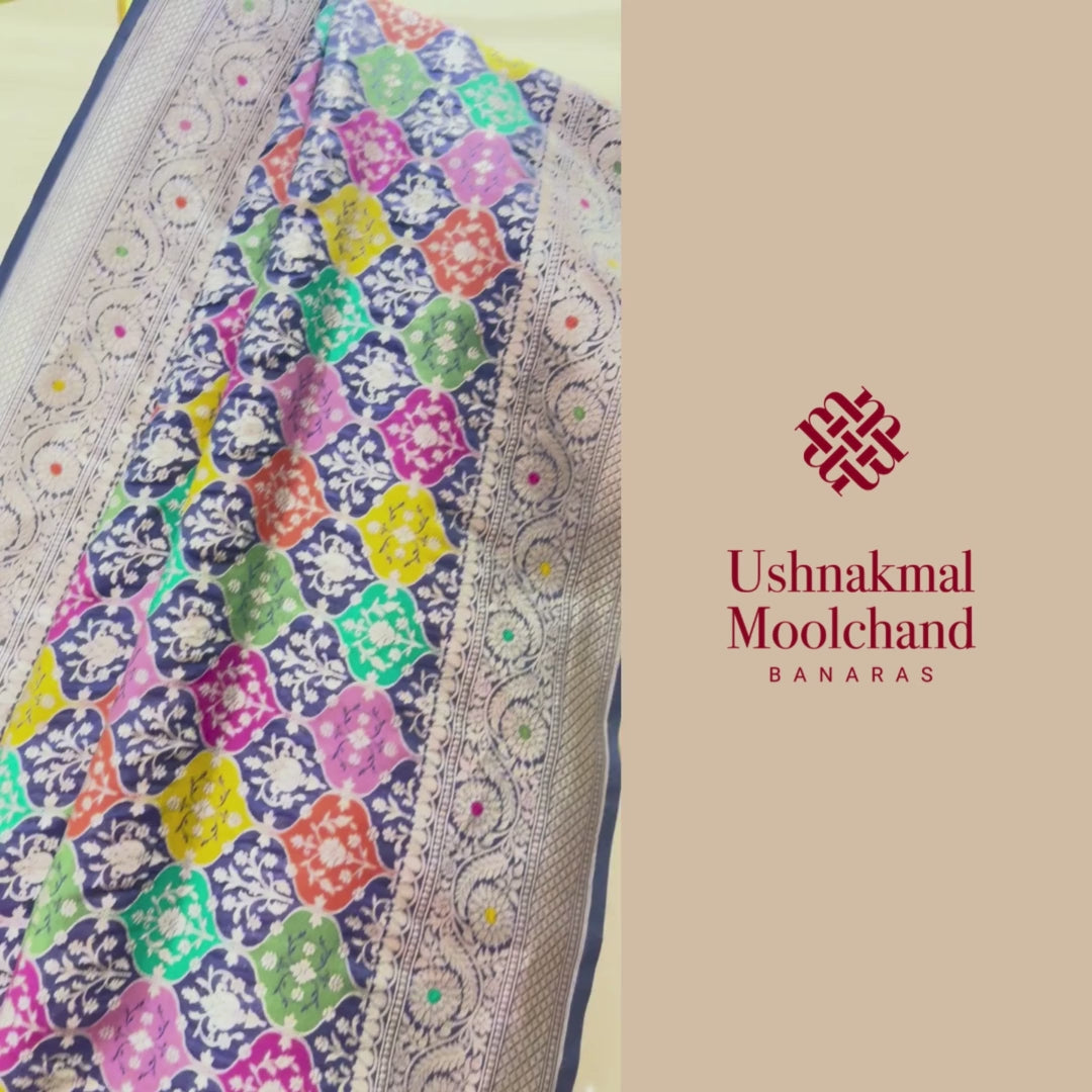 Design: A masterpiece of Banarasi craftsmanship, the Katan Silk Handloom Rangkat Motifs Saree is a symphony of colors and textures. Woven using the Kadhwa technique, the saree features exquisite multicolored motifs across the body, each intricately handcrafted in traditional floral and geometric designs. The play of vibrant hues—yellow, green, pink, orange, and purple—on a deep navy blue base creates a striking and regal composition. The saree is finished with an ornate silver zari border that adds a refined glimmer, perfectly balancing its vibrant design.
