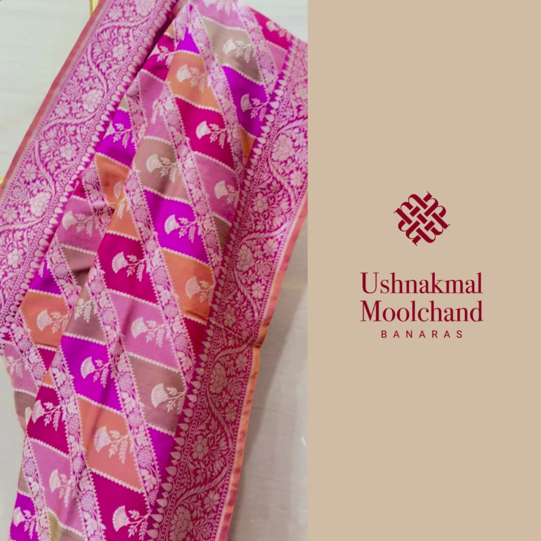 Speciality: The Rangkat weave, one of Banaras’s most complex techniques, seamlessly blends multiple colors in a single warp, a process achieved only through the mastery of skilled artisans. Enhanced with the precision of Kadhwa weaving, each motif is individually woven, resulting in an impeccable and long-lasting finish.