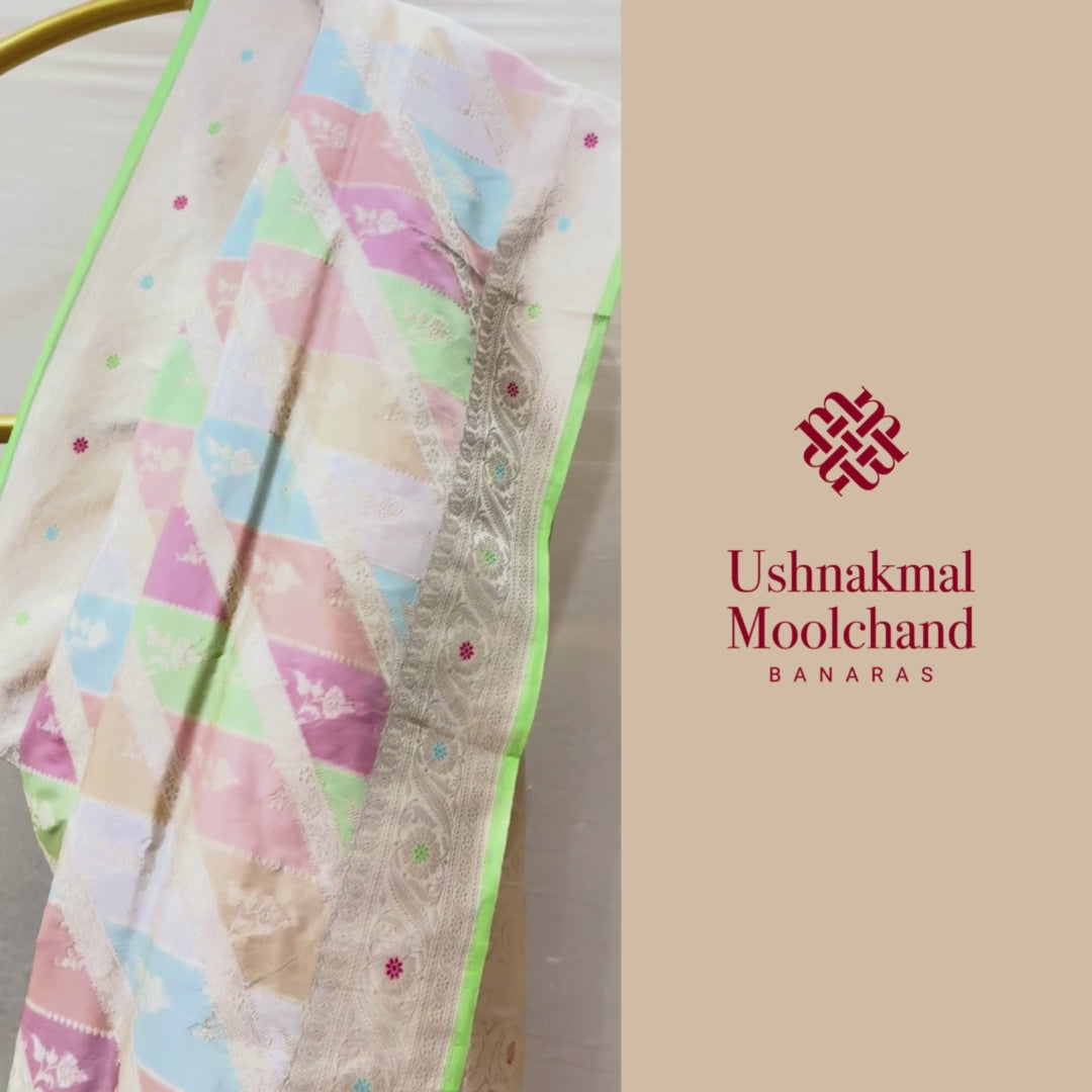 Color: Patel Shades of Blue, Pink, Orange, and Gold Fabric: Pure Katan Silk Weave/Technique: Rangkat Weave done using the Kadhwa Technique Design: The Katan Silk Handloom White Rangkat Saree is a radiant celebration of Banarasi...