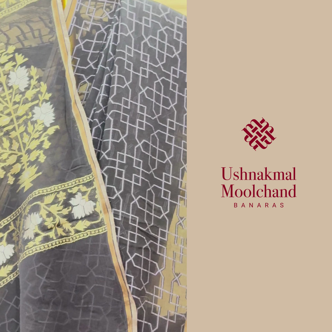 Design: The Khaddi Georgette Handloom Naqsha Saree in black is a masterpiece that celebrates lightness and elegance. Woven on handloom in the fine khaddi georgette weave, the saree drapes effortlessly with a soft, flowy texture. The body features a subtle geometric naqsha pattern that enhances its contemporary appeal, while the pallu is adorned with delicate roopa sona tilfi buta, adding a touch of shimmer and grace.
