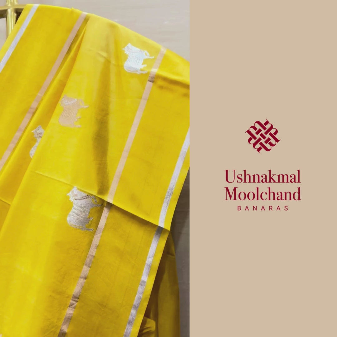 Design: From our Garden of Motifs Collection, this saree shines in a radiant yellow hue, beautifully framed with a dual zari border in gold and silver. The body is adorned with intricately woven Nandi motifs in zari, adding depth and symbolism to the piece. The subtle shimmer of the zari lining against the luminous yellow makes this saree perfect for festive and traditional occasions.