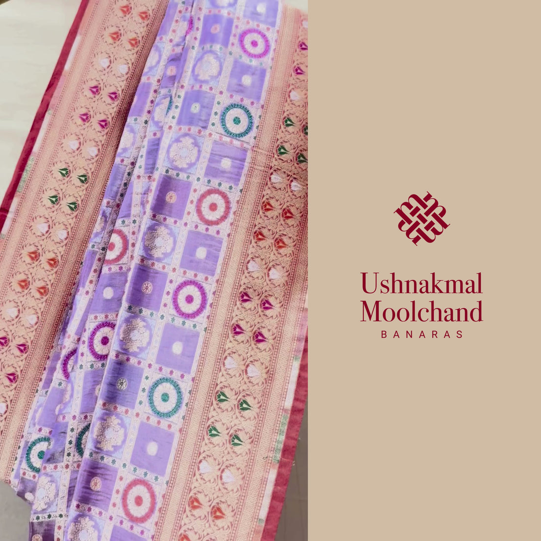 Design: The Tissue Silk Handloom Ghatchola Meenakari Saree is a vibrant celebration of color and craftsmanship. Set on a delicate lavender base, the saree is adorned with an intricate ghatchola weave, a traditional pattern defined by bold checks filled with motifs. The ghatchola design comes alive with a striking palette of green, red, pink, orange, and white, bringing festive richness to the drape. The border is detailed with zari small butas in the same vibrant colors, harmonizing beautifully with the body. The saree is further enhanced with a maroon kanni, which provides a deep, regal finish to the ensemble.