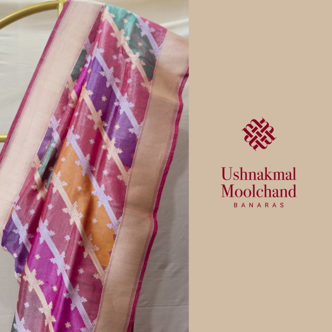 The sheer texture and gentle metallic sheen of tissue silk lend the saree an ethereal lightness, allowing the colours to appear almost translucent as they flow across the drape. Handwoven on traditional looms, the Maya Saree captures the artistry of Banaras through its harmonious balance of softness, structure, and visual depth.
